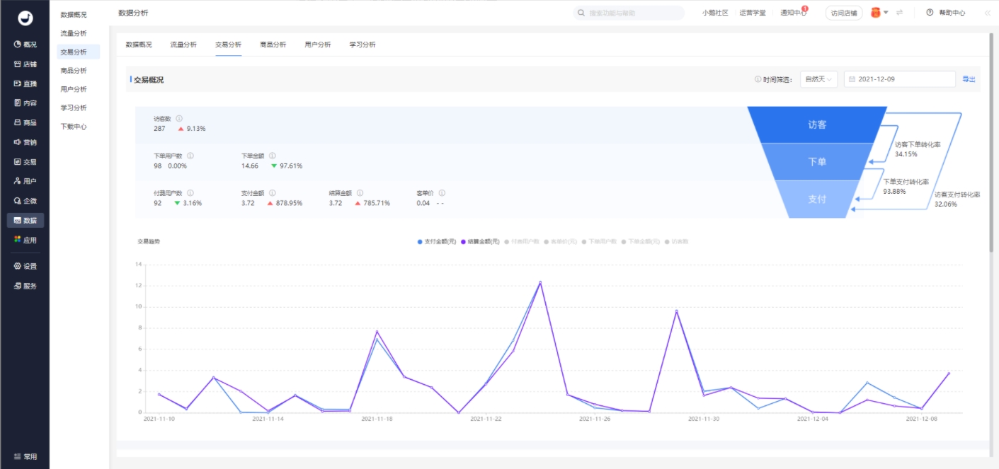 小鵝通的交易分析功能為商家提供了全面且深入的店鋪交易洞察。它不僅涵蓋了與店鋪交易息息相關的多個關鍵環節,如訪問量、下單量、支付轉化量,還精準地計算出各個環節的轉化率,讓商家能夠清晰地了解從用戶瀏覽到最終完成支付的整個流程中,每一步的轉化情況,從而發現潛在的問題與優化點。 此外,小鵝通交易分析還支持商家查看新老付費用戶的占比構成。通過這一數據,商家可以了解自己的用戶群體是如何發展的,新用戶的增長是否健...