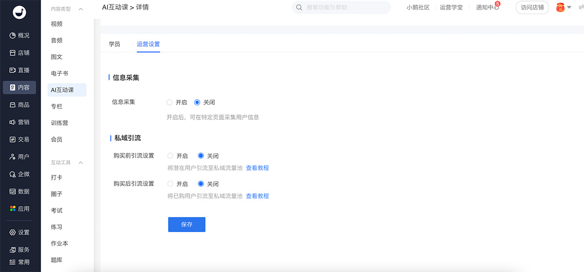 3、在詳情頁-運營設(shè)置頁面,開啟信息采集功能;